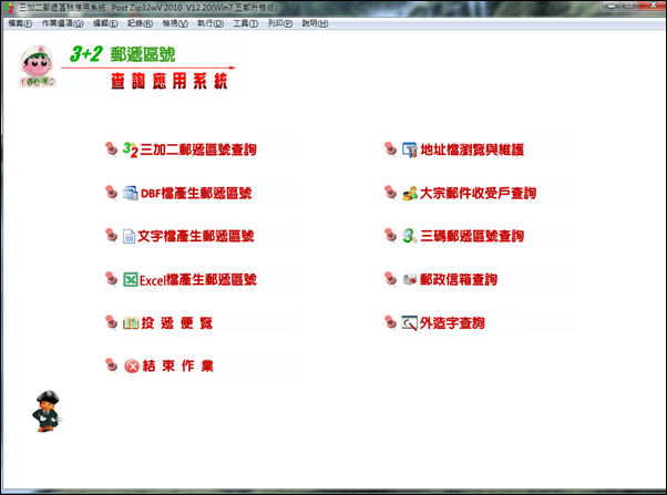3. 文字档产生邮递区号:读取事先备妥之地址档(.txt 档),产生各地址3+2 邮递区号,并可列印选取资料之报表及标签,供黏贴于信封上。