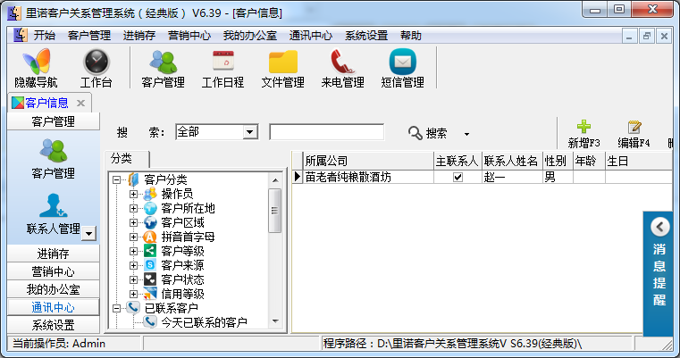点击打开左边菜单栏中的“客户管理”界面,在此界面中有“新增”、“编辑”、“删除”等功能。