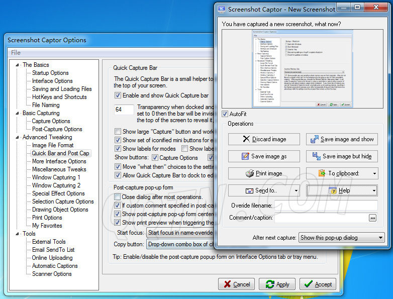 专业截图软件SCREENSHOT CAPTOR(截图捕手)是一个最好的一流的工具抓取,处理,注释和共享截图。 提起截屏(也有称为截图、抓图、屏捕),很多人会首先想到Hypersnap和Snagit。和他们比起来,SCREENSHOT CAPTOR 免费、体积小且更易于使用。