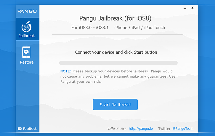 请先备份数据,虽然盘古越狱(iOS8)在大多数机型上都测试成功,还是希望您在越狱前备份您的数据以免造成数据丢失。