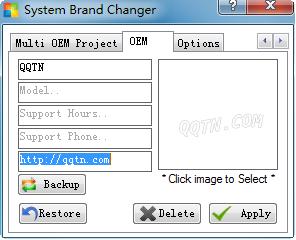 系统品牌更改System Brand Changer 将迅速改变你的系统品牌,可以选择保留的图像原始尺寸,使用它的默认大小,或者使用自定义尺寸。同样可以编辑您的OEM信息,备份和恢复。