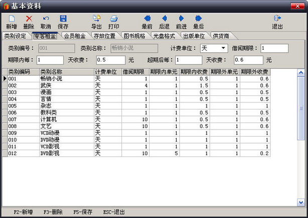 1、图书光盘分类管理,类别分为大类和小类两级,类别自由设定,可为每个大类指定不同的销售折扣、租金标准和押金标准。