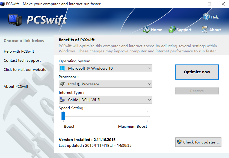 PCSwift执行快速热身,解决问题和优化您的计算机的性能和您的互联网用鼠标点击几下的速度。