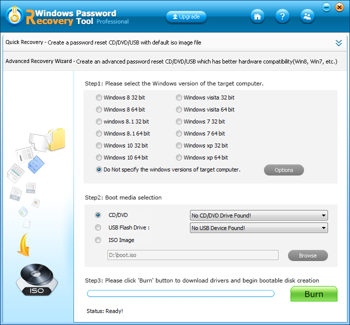 Windows密码恢复工具为您提供了两个选项来创建一个Windows密码重设盘(CD / DVD或USB闪存驱动器)。