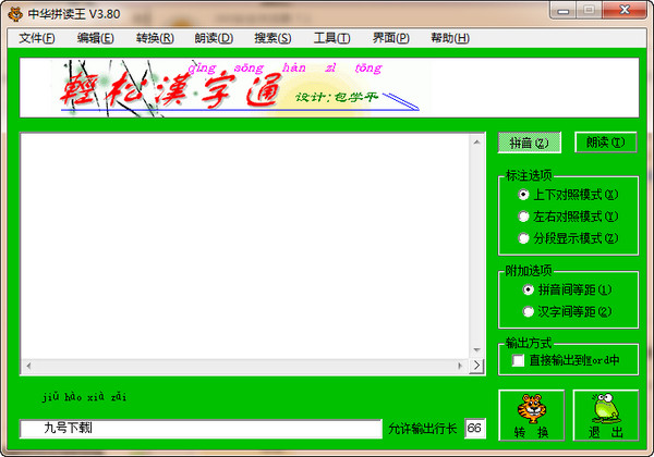 [中华拼读王]是目前世界上处理效果最理想、功能最强大的汉语拼音标注软件,该软件首创批量输入汉字即得到分行对照显示的汉字注音功能,采用规范标准的拼音标注方式,完全自动实现拼音声调的标注,具有各种强大的汉语拼音批量转换标注功能,并能根据上下文智能识别多音字、轻声字和部分儿化音,并具有直接将汉字转换成汉字与拼音上下一一对照并输出到WORD或WPS中的功能,转换格式多样,让你轻松快速录入汉语拼音,从此摆脱烦琐的符号输入方式。