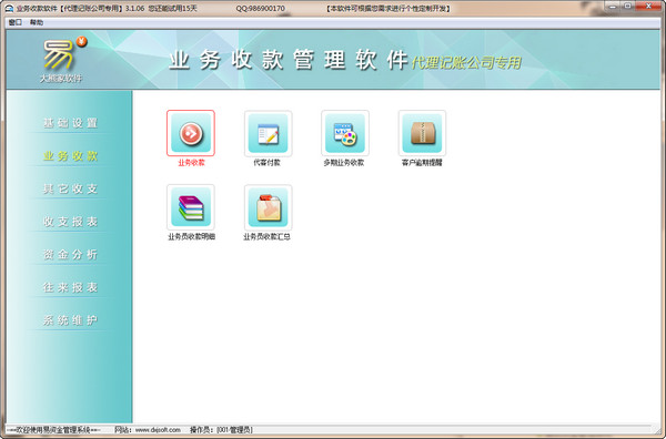业务收款管理系统是一款专为针对代理记账公司开发的收款管理软件,这款软件可用于管理客户记账费、报税费等每月固定首款情况等等。本软件简单、实用、易学、易用,将代理记账业务收款的繁琐简单化,帮助您解决代理记账收款管理难的问题。管理客户账务的同时,方便管理自己收支情况。