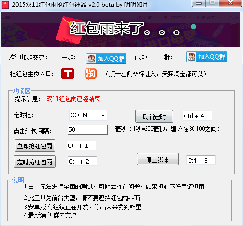 双十一来临啦,这个红包你抢了吗?大家可以使用2015双11红包雨抢红包神器,可以快速抢红包,不用动手速度更快,直接用脚本刷红包,so easy!
