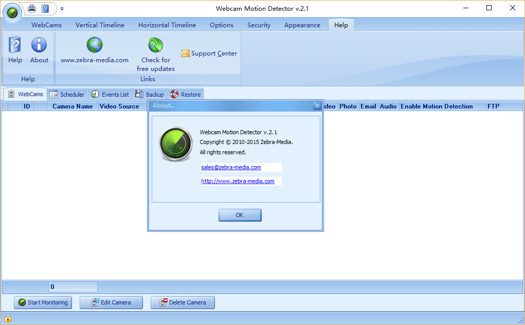 Zebra Webcam Motion Detector 是运动检测和摄像头监控软件。视频监控具有多个IP摄像机和视频捕获设备。对于每个视频帧,如果检测到运动,所述警报事件发生时,它返回一个全局运动比率,这取决于在其中检测到运动的细胞的数目,以及运动的每个单元中的水平。