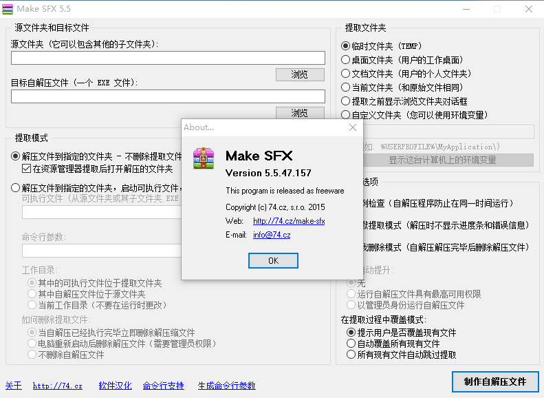 Make SFX 5.4 绿色汉化中文版是一个免费程序, Make SFX 是一个用于创建安装程序特别有用。可以让用户在Windows(86和64)平台的自解压文件。支持沉默的提取方式(提取时不显示进度条和错误消息)