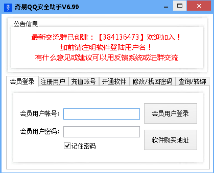 奇易QQ安全助手可以批量管理你的QQ帐号,具有批量解除限制、改密、查询、无保上保等功能,提供给需要QQ号批量管理的人使用。