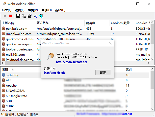 WebCookiesSniffer的上部窗格中显示的Cookie字符串,并发送或接收此cookie网站/主机名。