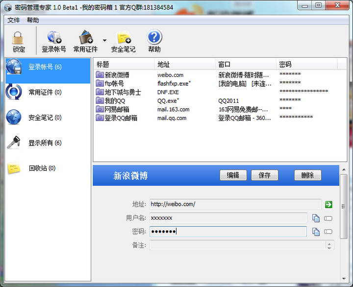 只需您记住一个主密码就可轻松管理您的各类帐号密码,如:银行、论坛、团购、邮箱、微博等的账号/密码/网址