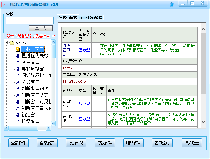 科鼎易语言代码段管理器是一款绿色免费,方便好用的易语言代码管理工具。目前支持双击代码加入易语言IDE界面,支持易语言代码格式显示,支持导入导出。感谢每一位支持我的易友!