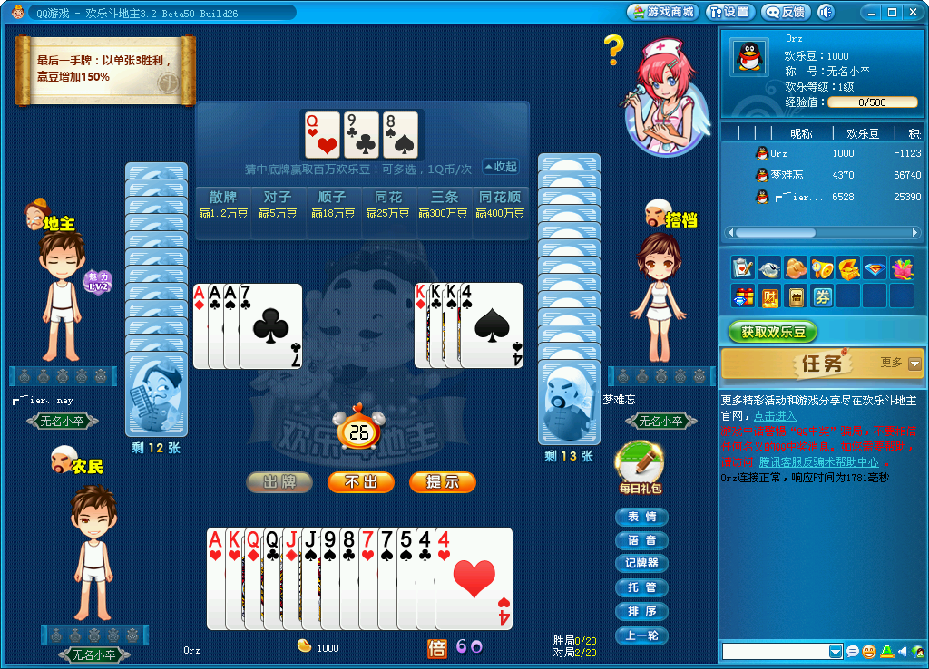 欢乐斗地主,是腾讯游戏根据地方斗地主扑克牌玩法开发的线上游戏,首先线上于QQ游戏大厅的PC端,随着移动互联网的兴起开发了欢乐斗地主手机版,让各位喜欢斗地主的玩家们随时随地都能斗起来。欢乐斗地主经过十多年的发展,游戏玩法也日益多样有趣,经典玩法加赖子玩法经久不衰,还有普通桌多倍桌让斗地主游戏更加好玩有趣。