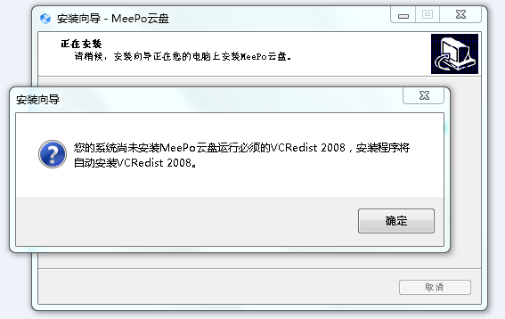 您的系统尚未安装MeePo云盘运行必须的VCRedist 2008,安装程序将自动安装VCRedist 2008。