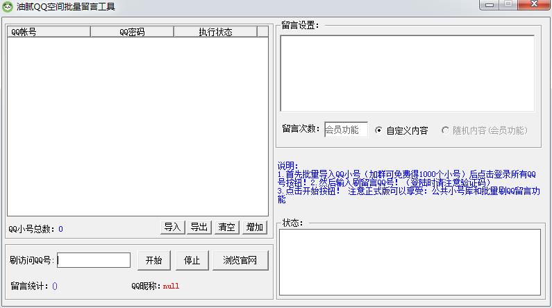 油腻QQ空间批量留言工具是一款用于QQ空间的辅助工具,这款软件可以帮助你通过小号在QQ空间进行批量留言,软件操作简单,首先批量导入QQ小号,之后点击登录所有QQ号按钮!然后输入刷留言QQ,点击开始按钮即可。注意正式版可以享受公共小号库和批量刷QQ留言功能,欢迎下载!