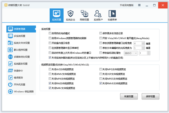 软媒设置大师可以帮助用户便捷的设置系统中各项参数,包括了资源管理器快捷命令、开关机设置、系统更新、Hosts文件管理、驱动设置、网络加速设置、网络共享设置、用户登陆管理、UAC账户控制、右键菜单等。
