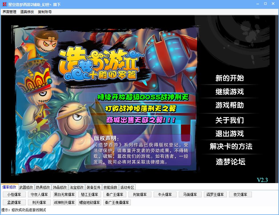 造梦西游5修改器终于研发成功了,相信很多小伙伴都会十分的激动,毕竟对于造梦4小伙伴都已经开始玩腻了,有了造梦西游5修改器,就可以让你们在造梦西游5中快速登录外,还可以获得清理白屏、无限连击、爆率修改、一键