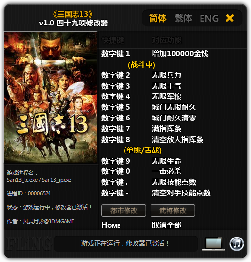 三国志13四十五项修改器是由3DM风灵月影制作的最新的一款三国志13修改器,这款三国志13修改器拥有多达四十五项修改功能,这个修改器支持无限兵力、无限士气、无限军粮、城门无限耐久、无限人口等等功能,同时还支持简体、繁体、English三种语言切换,喜欢玩三国志13的朋友千万不可错过这款修改器!