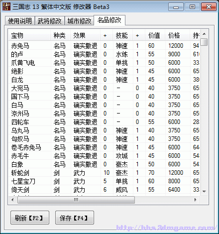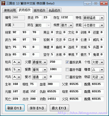 三国志13修改器繁中版是一款专门针对San13制作的武将和城市修改器,这款修改器由3DM论坛 @银河漫步 制作分享,这款三国志13修改器可以帮助玩家进行城市修改、武将修改和名品修改,喜欢玩三国志13的朋友千万不要错过这款超强修改器!