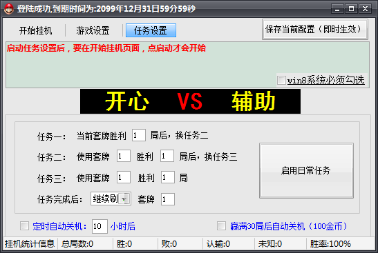 关闭挂机统计后,赢100金币自动关机、连赢3局认输1局、自动日常任务。这3个功能将不能使用