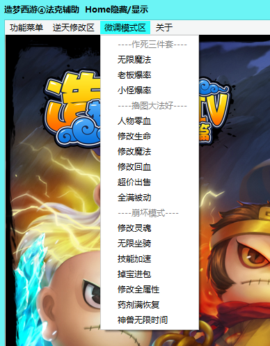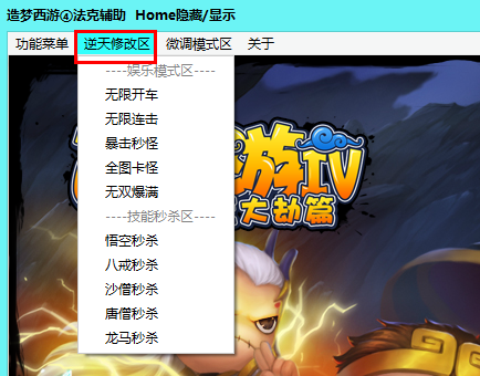 造梦西游4法克辅助按HOME键隐藏、显示主窗口,主要将功能分为功能菜单、逆天修改区、微调模式区、功能1区、高仿CE五大类型。