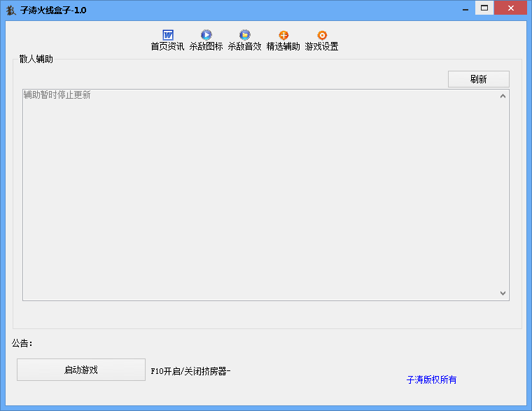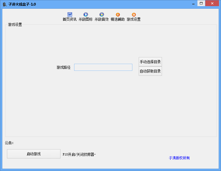 子涛火线盒子目前提供游戏资讯、杀敌图标、杀敌音效、辅助推荐四类功能,使用时请先到游戏设置界面选择游戏路径再使用。