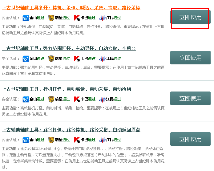主要功能:挂机杀怪、自动喊话、采集、自动捡取、定点挂机、路径杀怪。重要提示:在使用上古世纪辅助工具之前请认真阅读上古世纪脚本使用说明。