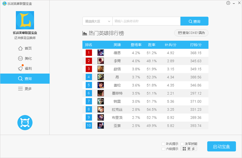 乐派LOL宝盒绿色版免安装,下载解压后即可使用,适合网吧和不爱麻烦的用户使用。主要向玩家提供游戏资讯、皮肤体验、综合查询以及扩展功能等,是英雄联盟最好的辅助工具。