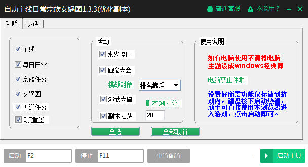 功能:自动主线、日常任务、宗族任务、女娲图、喊话、天道任务、单人副本、冰火淬体