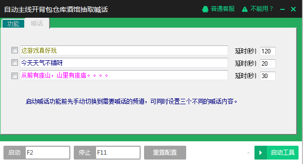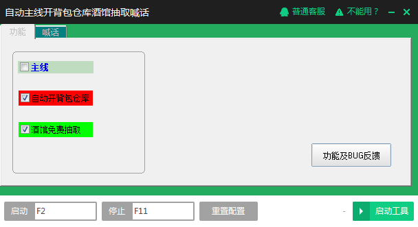 功能:自动主线、自动开背包仓库、酒馆免费抽取、自动喊话