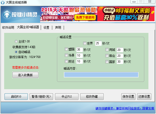 光从名字上来看大国主线喊话器,就能得出,它是大国游戏的辅助工具,提供了自主主线任务和自动喊话功能。其中免费版主线仅支持1-30级。