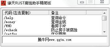 缘天RUST腐蚀助手精简版仅提供游戏相关命令代码,玩家可在搜索框中快速找到你想要的命令代码,然后左键点击代码就复制上啦。