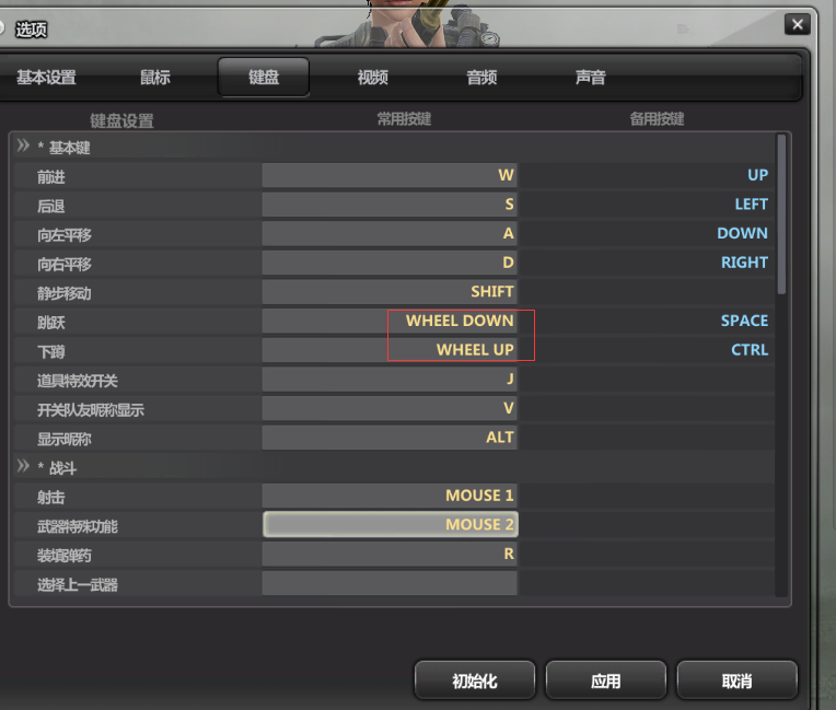 第一是高配视频模式,滚轮下跳上蹲,就是设置了很高的视频配置,本人显卡GTX760所以可以设置无压力,如果你觉得高配卡了可以自己调节为默认的,点下面的初始化,选择当前页面就行,不要选择全部,否则键位会失效。可能有窗口化
