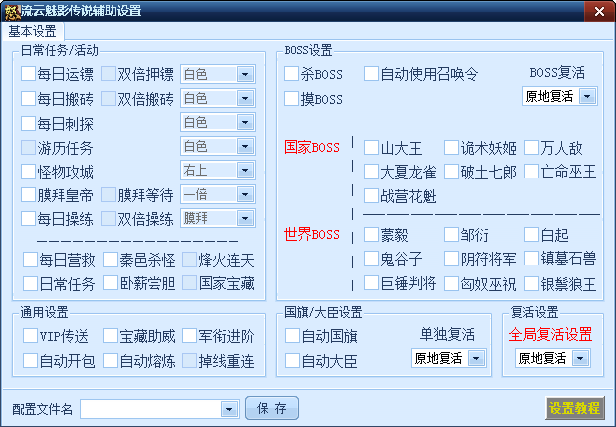 流云战国之怒辅助提供了自动日常/营救/运镖/刺探/BOSS/搬砖/膜拜/重连等功能,支持各大游戏平台,供玩家免费试用。