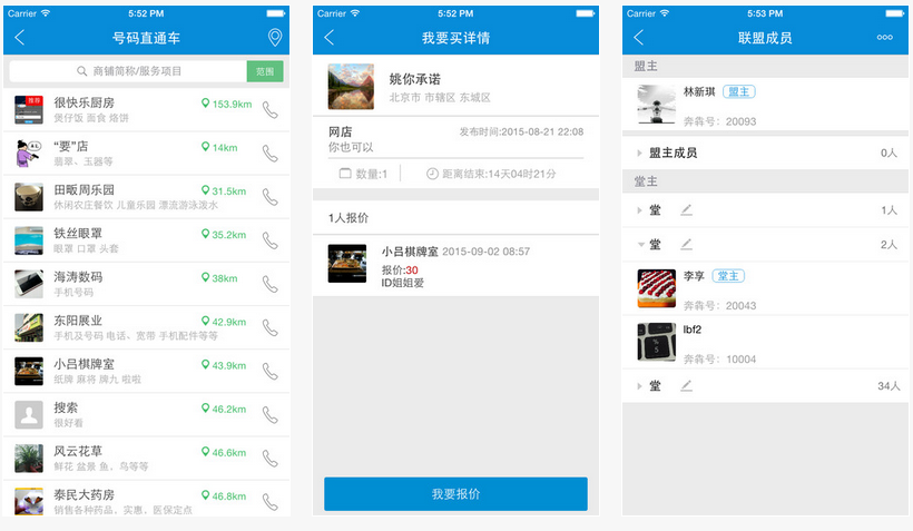 用户可以模糊搜索您的商家或服务,所有的商家信息按距离由近及远排列,还可按地区与行业查找。