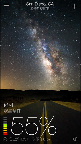 观星预报Sky Live iphone版 是一个观测星空的提醒软件。它会告诉你什么时间什么地方适合观测星象。如果你是一个天文爱好者不妨可以试试。此软件同时还支持Apple Watch版本。